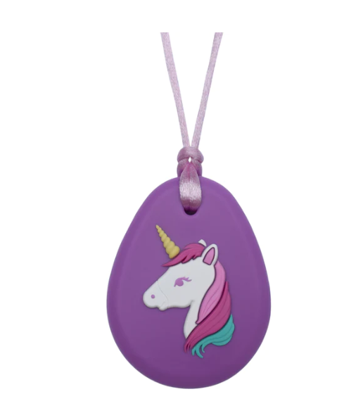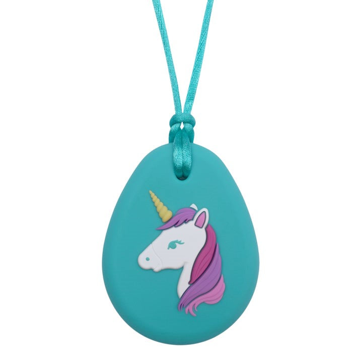 This popular design and has proven to be a durable necklace ideal for mild to moderate chewers. This pendant features an inset unicorn design on the front side and raised nubs in the outline of a heart on the back, which is ideal for added sensory interest. The necklace measures 5cm or 2" in diameter.